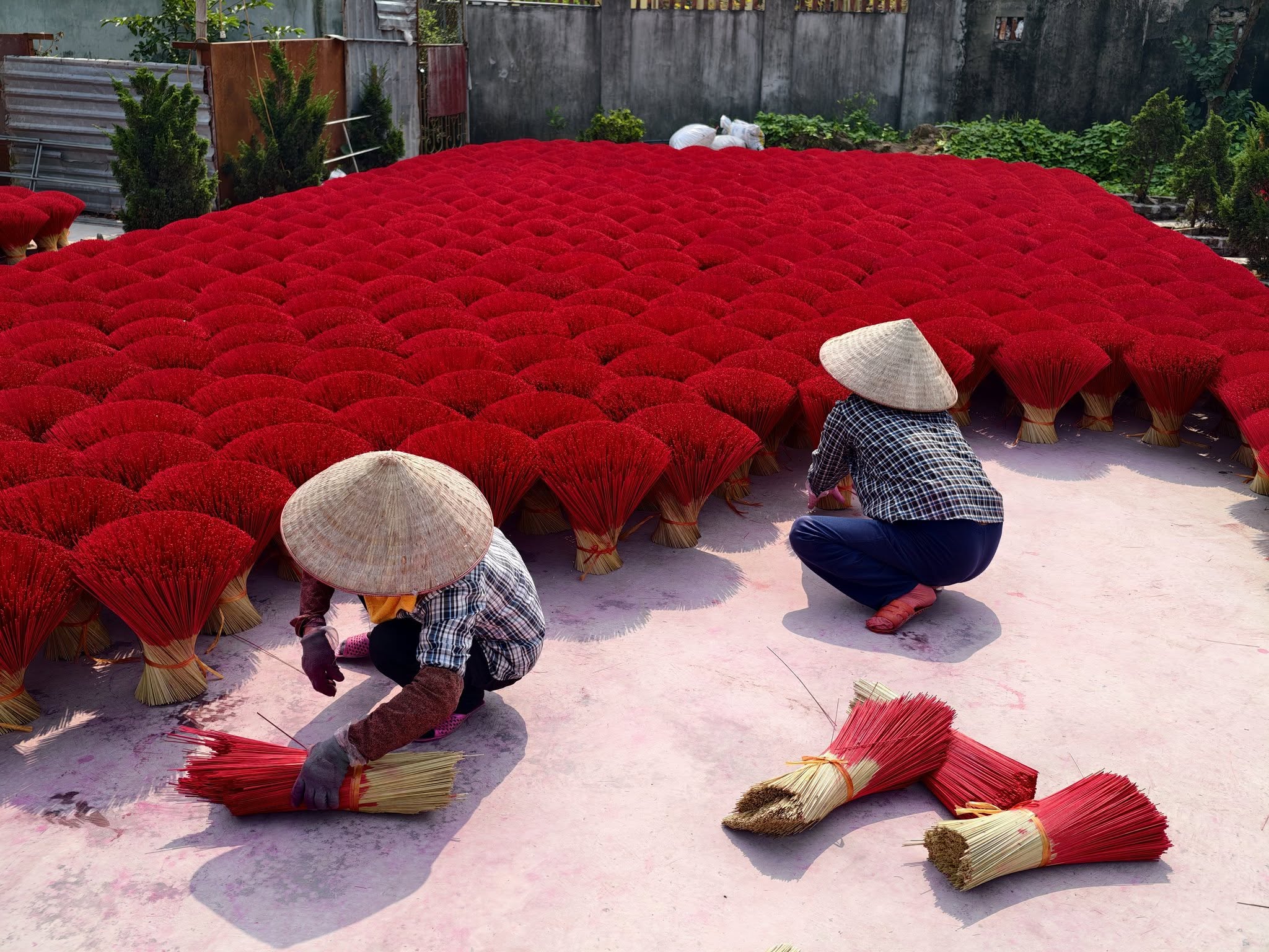 A la llegada, los visitantes quedan inmediatamente impresionados por el predominante rojo brillante de las varitas de incienso, cuidadosamente dispuestas en los patios, a lo largo de las callejuelas y frente a las casas. Este llamativo contraste entre los vivos colores del incienso y la sencillez de la arquitectura rural crea una atmósfera única, difícil de encontrar en ningún otro lugar de Vietnam.
