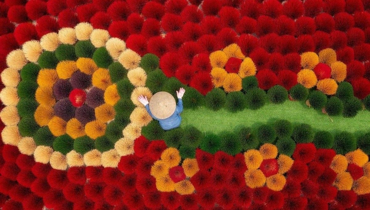 Después de la aplicación de la pasta aromática, las varillas de incienso se disponen en abanico o en círculo y se dejan secar al sol. Es en ese momento cuando la aldea revela su aspecto más espectacular. Los patios se transforman en mosaicos coloridos, ofreciendo composiciones casi artísticas, dictadas enteramente por las necesidades del trabajo diario.