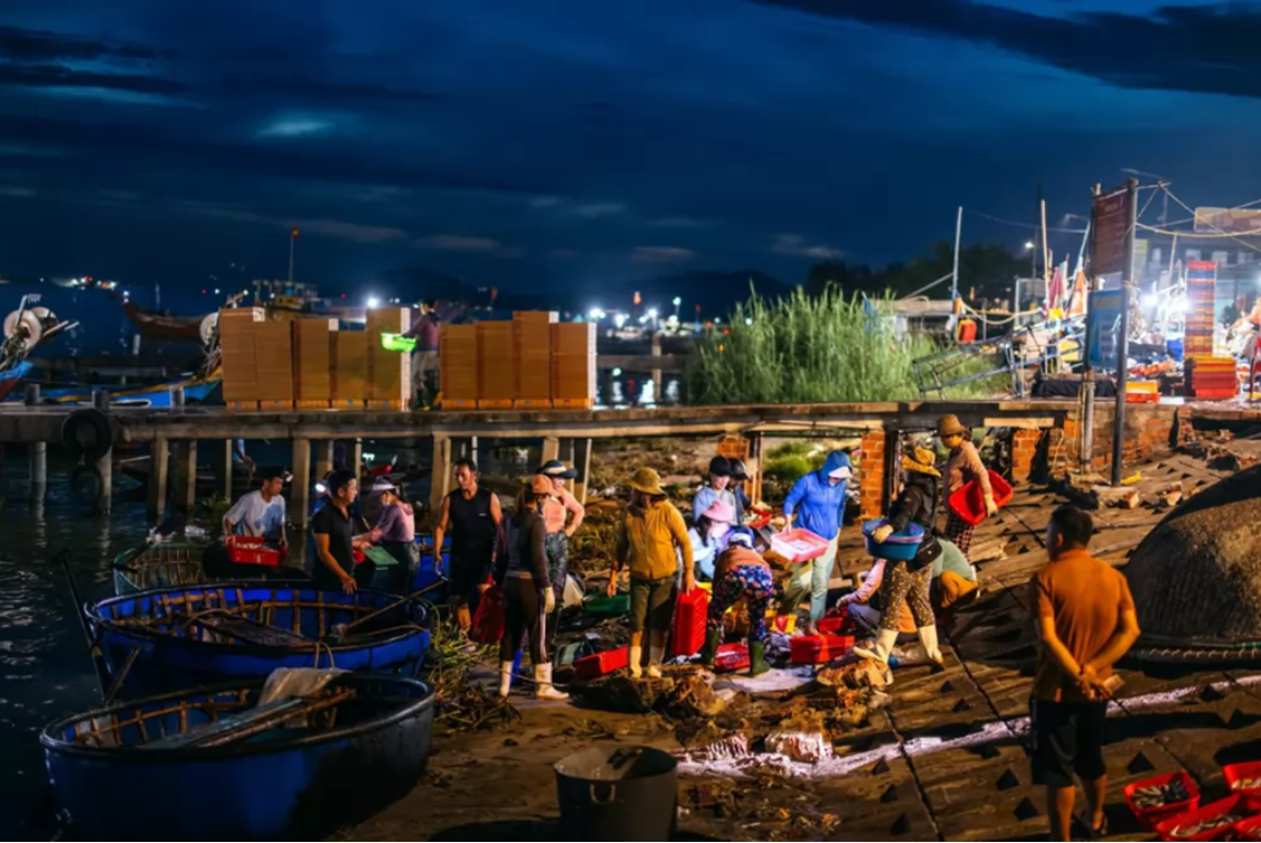 Entre las 4:30 y las 6:00 de la mañana, esta zona se anima con cientos de barcos de pesca que regresan de alta mar. Cuando el sol se eleva poco a poco, sus rayos se reflejan en las aguas del río Thu Bồn y brillan sobre el pescado fresco, mientras los llamados de los vendedores crean un ambiente vivo y auténtico.